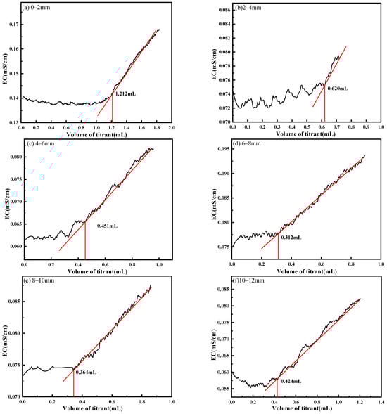 Determination of sulfate content in cement-based materials at different depths by conductometric titration. (a) 0–2 mm; (b) 2–4 mm; (c) 4–6 mm; (d) 6–8 mm; (e) 8–10 mm; (f) 10–12 mm.