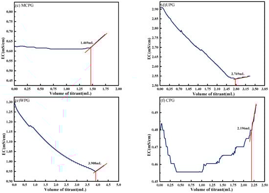 In this experimental study, the grinding thickness of PG-based cementitious material was 2 mm, the mass of powder used for leaching was 2 g, the weighing accuracy was 0.0001 g, the volume was 20 mL, the volume of titration solution was 5 mL, and the concentration of Ba(NO3)2 was 0.05 mol/L. The titration results are shown in Figure 18, where the volume of Ba(NO3)2 solution consumed for titration, measured by conductometric titration, was different for different samples in this experiment. For the test samples, M stands for hydrophobically modified, UPG for as-received phosphogypsum, WPG for washed phosphogypsum, and CPG for calcined phosphogypsum. The volumes of titrant consumed for each sample, according to Figure 18a–f, were 2.233, 0.758, 1.469, 2.769, 3.908, and 2.196 mL.