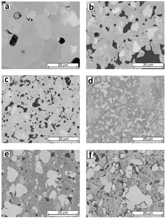 Figure 1 (and Figure S4 in Supplementary Materials) shows SEM images of microstructures of the composites, which agree with the measured density of composites. The least dense composite was the composite without additives (HP_0), where significant porosity and extensive grain growth can be observed (Figure 1a). The microstructure of other composites was typical for dense materials (Figure 1b–f). The density-dependent gray shades of the various phases present in the material corresponded to the complex phase composition of the composites determined by XRD. In addition, composites with carbide and silicide additions had homogeneous microstructures (Figure 1b–f).
