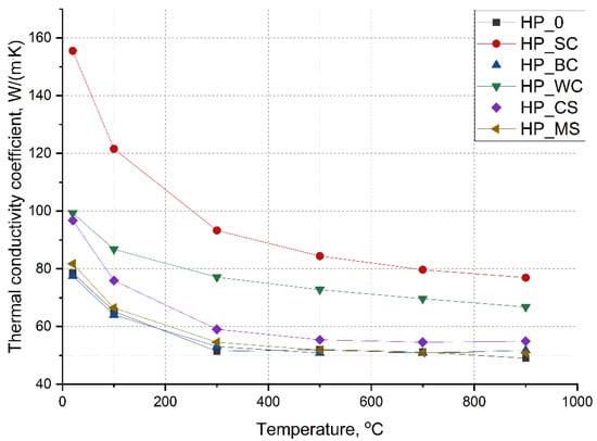 Figure 2 illustrates the relationship between thermal conductivity and temperature measured for all studied composites. The thermal conductivity coefficient was calculated from the thermal diffusivity (α) and apparent density measurements and specific heat (Cp) calculations (Equations (1) and (2)).