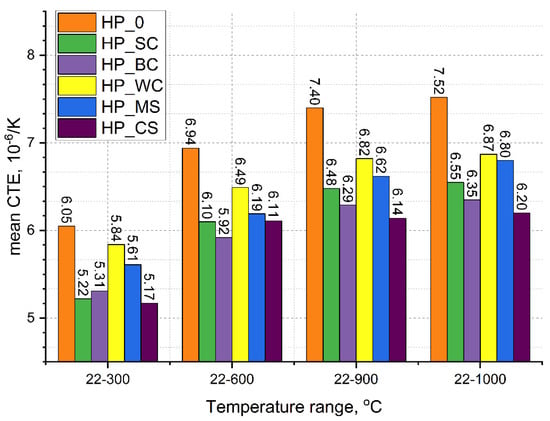 Figure 3 shows changes in the coefficient of linear expansion of the composites in different temperature ranges. Regardless of the temperature range, the lowest CTE values were shown for composites with SiC (HP_SC), CrSi2 (HP_CS), and B4C (HP_BC) additives, for which the CTE values ranged from about 5.2 to about 6.5 × 10−6 1/K. The CTE of composites with WC (HP_WC) and MoSi2 (HP_MS) ranged from 5.61 to 6.87 × 10−6 1/K. The largest CTE values, ranging from 6.05 to 7.52 × 10−6 1/K, were characteristic for the composite without additives (HP_0).