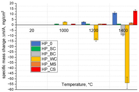 Figure 4 presents mass changes related to oxidized ceramics. Mass changes of the samples were recorded at 1000, 1200, and 1400 °C. The mass of samples of most composites did not change much up to 1000 °C. The exception was the composite with the WC addition (HP_WC), in which the mass of the sample noticeably increased. An increase in the oxidation temperature to 1200 °C caused a decrease in the mass of the HP_WC sample, which was even larger at 1400 °C. In the case of the sample with the addition of boron carbide (HP_BC) at 1400 °C, a mass loss was observed. In contrast, a mass gain was seen in HP_0 and HP_CS composites oxidized at 1400 °C, while up to 1200 °C, the mass of these composites changed slightly. A minimal increase in mass was observed for the composite with SiC (HP_SC) already at 1000 °C, but increased oxidation temperature practically did not cause further mass changes. The composite with the MoSi2 addition (HP_MS) behaved similarly, but in this case a progressive slight increase in the weight of the composite with an increase in the oxidation temperature was evident.