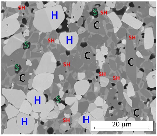 Microstructure of the ZrB2-HfB2-MoSi2 composite (C—core ZrB2; SH—shell (Zr,Hf)B2; H—HfB2; and S—SiC or SiO2).