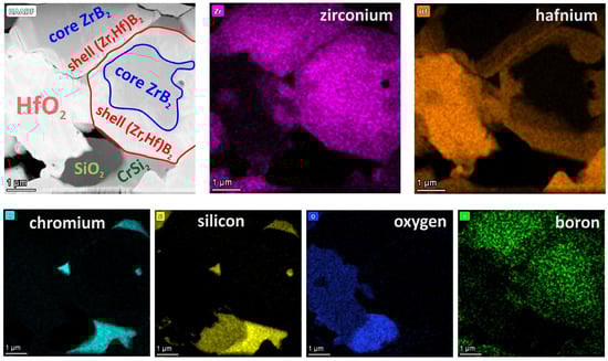 During sintering, various reactions take place between boride, carbide, or silicide additives and oxide impurities. It is also possible that reactive liquid phases from the Si-B-O system are formed during sintering, due to which sintering is activated, with oxide impurities being mostly reduced when carbides are added (Table 3). The presence of liquid phases can be responsible for the formation of microstructures typical of cermets [31,32,33,34,35], which is the case when silicides are added (Figure 1 and Figure 5). The microstructure of composites with MoSi2 or CrSi2 additives shows grain boundaries and binding phases that can be amorphous [32], as well as hard grain interiors and grain rims that are mainly solid solutions of (Zr,Hf)B2, which affects the mechanical and thermal properties of the materials (Figure 5 and Figure 6).