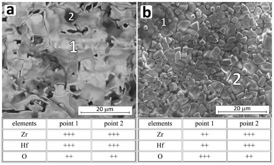 The phase composition of the sintered composites is summarized in Table 4. The Table 4 shows solid solutions (Zr,Hf)B2 (1) and (Zr,Hf)B2 (2) with the same structure but different lattice parameters.