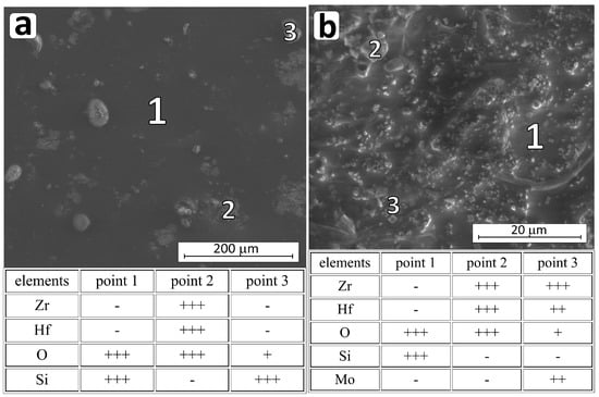 In systems with MoSi2, oxidation produces stable, high-melting zirconium and hafnium oxides (Equation (19)), whose particles are dispersed in a tight amorphous Si-O-B layer. Figure 8b illustrates the surface of the ZrB2-HfB2-MoSi2 composite, which, according to the data presented, is covered by an SiO2 layer (Equations (16)–(19)), in which particles of zirconium, hafnium, and molybdenum oxides can be identified (Equations (16) and (19), Figure 8b).