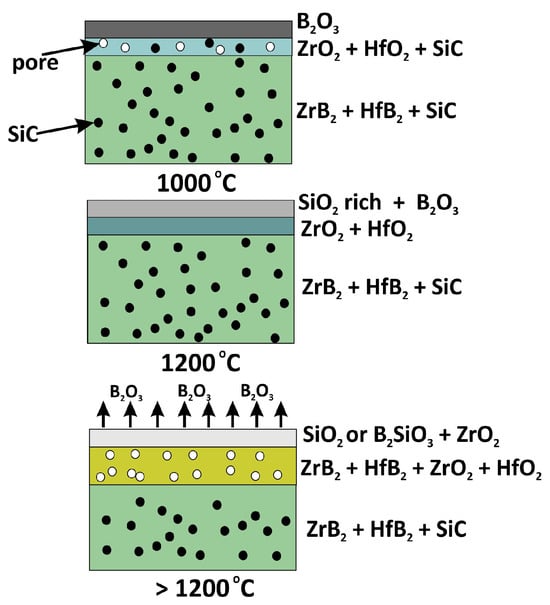 The presence of crystalline zirconium and hafnium oxides and zirconium silicate is reasonable. During oxidation, a reaction of zirconium and hafnium borides with oxygen produces stable zirconium and hafnium oxides (Equations (12) and (13)) and liquid boron oxide [19,21]. Further heating leads to the transition of liquid B2O3 to gaseous B2O3 (Equation (14)) above 1100 °C. In the case of SiC, silica is formed during oxidation (Equation (15)), and then some of the B2O3 can dissolve into SiO2 (Equation (11)) and form boro-silicate glass [19,57].