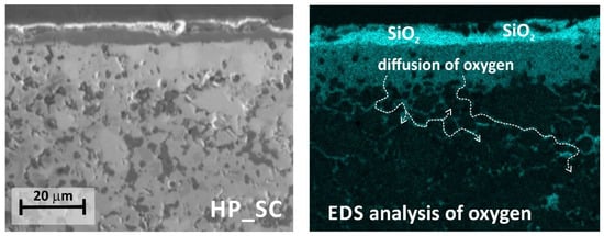 EDS chemical analysis further shows how oxygen diffuses inside the HP_SC composite (Figure 10). As can be seen in Figure 10, oxygen diffuses into the interior of the composite along grain boundaries. The grain boundaries can be regarded as defects in the microstructure. From this point of view, oxygen diffusion across grain boundaries in the ZrB2-HfB2-SiC composite is as likely as possible.