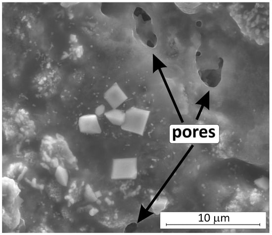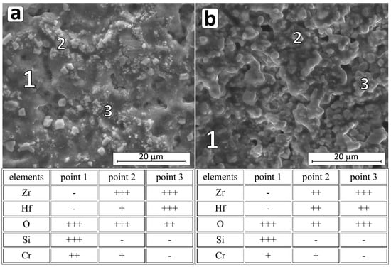 The formation of CrO3 and CrO2 is thermodynamically more favorable compared to Cr2O3 [47,59]. However, the mass gain of the sample during the oxidation (Figure S11 in Supplementary Materials) and the results of the XRD analysis of the composite surface after oxidation at 1400 °C (Table 5) indicated the presence of Cr2O3 only. With limited oxygen supply through a layer of liquid B2O3 at temperatures not exceeding 1200 °C, the formation of Cr2O3 is preferred [47,59]. On the other hand, both CrO3 and CrO2 oxides exist only in the gaseous state, so it is possible that during their volatilization, pores are formed in the SiO2 surface layer, which can be observed in Figure 11b and Figure 12. The increase in oxidation temperature from 1200 to 1400 °C causes growth of crystallites of stable oxides of chromium (III), zirconium (IV), and hafnium (IV) (Figure 12).