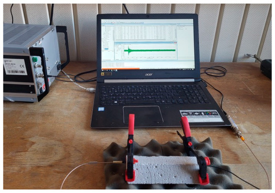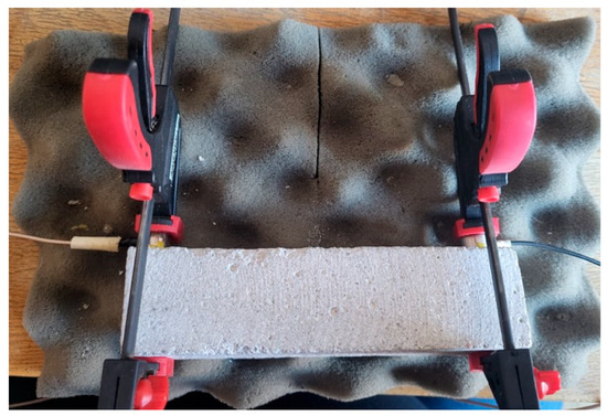 All measurements were performed under laboratory conditions at 21 ± 1 °C and a relative humidity of 45 ± 5%. The photo illustrated in Figure 2, showing the prismatic mortar specimen clamped between the transmitting and receiving transducers on a profiled polyurethane foam pad, provided stable coupling and highly repeatable through-transmission measurements, enabling the rapid assessment of surface treatments in cementitious materials.