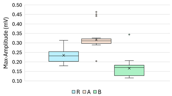 Boxplot of the maximum amplitude values (mV) for Groups R (reference), A (treatment A), and B (treatment B).