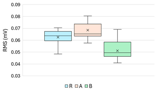 Boxplot of the RMS voltage values (mV) across the reference (R), treatment A, and treatment B.