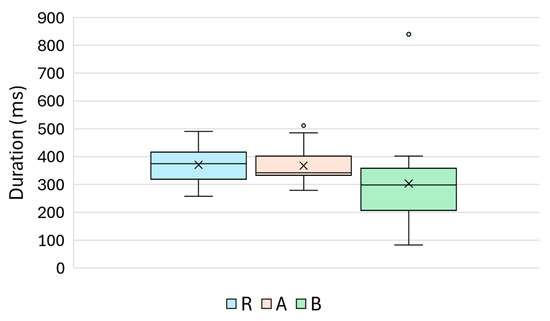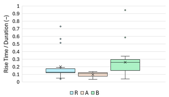 Boxplot of the rise time/duration ratio (–) for Groups R, A, and B.