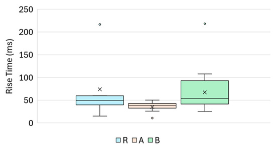 As illustrated in Figure 17, Group A exhibited the lowest median value (≈0.09), indicating a relatively fast signal onset in proportion to duration. Reference Group R showed a broader distribution centred around a slightly higher value (≈0.12), whereas Group B demonstrated the largest spread including multiple outliers and a higher central tendency (≈0.14).