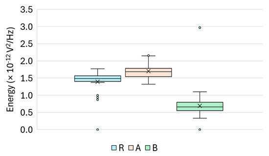 These results suggest that the energy parameter was particularly effective in identifying sealer-treated specimens (B), whereas its ability to differentiate silicate-treated specimens (A) from the untreated ones (R) was limited. Therefore, while highly valuable in high-contrast scenarios, energy may benefit from a combination with other features, such as amplitude or RMS, in broader classification tasks.