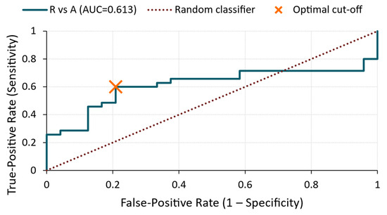 The ROC curve yielded an AUC of 0.61, suggesting only a moderate classification accuracy. At the optimal cut-off value of 1.65 × 10−12 V2/Hz, the model achieved 100% specificity but only 60% sensitivity, indicating that only a subset of A-treated specimens exhibited energy levels that were significantly higher than those of the reference group.