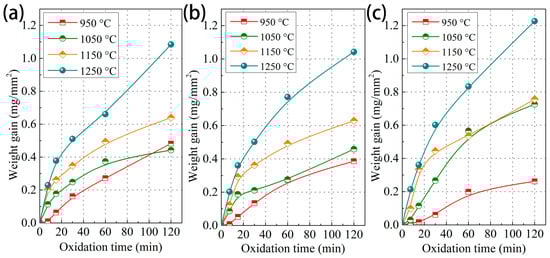 Figure 1 shows the oxidation weight gain curves of the Cr0.015, Cr0.15, and Cr1 steels exposed to 950, 1050, 1150, and 1250 °C for 120 min. All the steels display increasing oxidation weight gain with increasing temperature and time. In particular, in Figure 1a, the oxidation weight gain of the Cr0.015 steel steadily increases with increasing temperature, and under a duration of 120 min, the steel exhibits weight gain values of 0.48 mg/mm2 at 950 °C, 0.44 mg/mm2 at 1050 °C, 0.64 mg/mm2 at 1150 °C, and 1.08 mg/mm2 at 1250 °C, respectively. When the Cr content increases to 0.15 wt.% (Figure 1b), the steel exhibits a decreasing trend of oxidation weight gain in comparison with the Cr0.015 case; for example, an oxidation weight gain of 0.39 mg/mm2 at 950 °C is achieved (0.48 mg/mm2 for Cr0.015 steel). With a further increase in Cr concentration (Figure 1c), the weight gain of the Cr1 steel shows an obvious decreasing value of 0.26 mg/mm2 at 950 °C, while it exhibits significantly increased values at 1050, 1150, and 1250 °C. In particular, at 1250 °C, the oxidation weight gain of the Cr1 steel is 1.23 mg/mm2, which is even higher than that of the Cr0.015 steel under the same oxidation conditions.