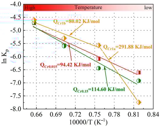 where K0 is the model constant, R is the gas constant, and T is the absolute temperature. Based on Equation (3), the activation energy can be determined using the slope relationship between lnKp and 10,000/T, as shown in Figure 2. The determined activation energy values of the Cr0.015 and Cr0.15 steels were 94.42 and 114.60 KJ/mol, respectively. However, two activation energy values were obtained for the Cr1 steel: one was 291.88 KJ/mol under an oxidation temperature of 950 °C; the other was 80.02 KJ/mol when the oxidation temperature varied from 1050 °C to 1250 °C. The obtained activation energy is similar to that of low-alloyed steels, whose activation energy is 73.1–339 KJ/mol [26,27,28]. The two-stage change in the oxidation activation energy of the Cr1 steel corresponds to the change in the oxidation rate constant and weight gain.