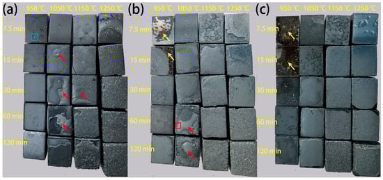 Figure 3 provides surface images of the investigated steels after oxidation under various temperatures and durations. It can be seen from Figure 3a that the color of the Cr0.015 steel at the initial oxidation stage is dark gray, as exemplified by the sample oxidized at 950 °C for 7.5 min. With increasing isothermal temperature and time, the color gradually brightens, as shown in the surface images of the sample oxidized at 950 °C for 120 min. When the oxidation temperature and time further increase, a rough surface with some covered particles is observed (oxidized at 1150 °C for 15 min and above). The same trend also occurs in the Cr0.15 steel (Figure 3b) and the Cr1 steel (Figure 3c). An apparent difference is that compared to the Cr0.015 steel, the colors of the Cr0.15 and Cr1 steels are much darker at the initial oxidation stage, as indicated by the yellow arrows in Figure 3b,c. Moreover, the occurrence of a rough surface with covered particles is observed at much higher isothermal temperatures and durations, namely, at 1150 °C maintained for 30 min for Cr0.15 steel, and at 1150 °C maintained for 60 min for Cr1 steel. In addition, blisters at the scale surface are formed, as marked using red arrows, and this blistering behavior is relieved with an increasing Cr content, with no obvious blisters at the surface occurring in the Cr1 steel.
