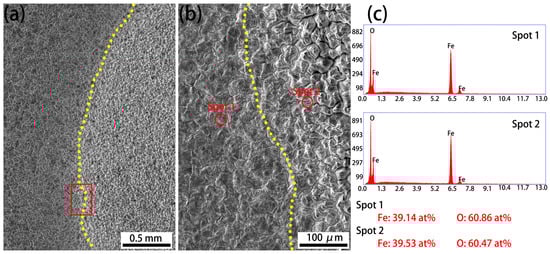 The SEM images and the corresponding energy-dispersive spectrometer (EDS) analysis profiles of the red-rectangle region in Figure 3b, showing blisters, are provided in Figure 4. Differences in the grain size of the oxide scale between the blistering region and the flat region, divided by the yellow line, can be observed in Figure 4a,b. The EDS profiles of both regions, however, reveal the same composition, indicating that the oxide scale is Fe2O3. It is reported that two mechanisms—generated stress and gas (CO/CO2) release—are responsible for the occurrence of blistering during the oxidation of the steels [29,30,31]. Figure 4 clearly reveals differences in the grain size of Fe2O3, indicating internal stress generation during scale formation. The release of gas (CO/CO2) is believed to have been limited because the carbon concentration of the investigated steels is quite low [29,30]. Therefore, blistering at the oxide surface occurred mainly due to the internal stress caused by grain size differences.