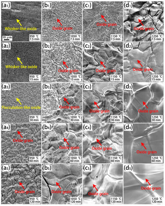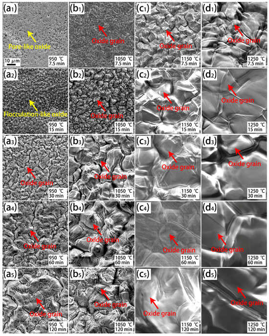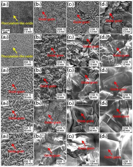 SEM observation of the surface morphologies of the oxide scale on the Cr0.015 steel after isothermal oxidation at various temperatures and durations. (a1–a5) Exposed to 950 °C for 7.5 min–120 min; (b1–b5) exposed to 1050 °C for 7.5 min–120 min; (c1–c5) exposed to 1150 °C for 7.5 min–120 min; and (d1–d5) exposed to 1250 °C for 7.5 min–120 min.