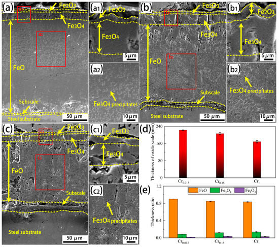 Figure 8 presents the cross-sectional morphology of the oxide scale on the investigated steels. In accordance with the cross-sectional morphology and EDS line scanning, as depicted in Figure 9 and Figure 10, all the studied steels develop a four-layered oxide scale, which, from the outer to the inner layer, consists of an Fe2O3 layer, an Fe3O4 layer, an FeO layer, and a subscale on the steel substrate. Based on the EDS results, it can be concluded that the subscale on the steel substrate is a Cr-rich layer or a (Cr, Si)-rich layer. Specifically, for the Cr0.015 steel, the Fe2O3 layer is thinner than the Fe3O4 layer, as shown in Figure 8a and its local high-magnification image (Figure 8(a1)). Moreover, many Fe3O4 precipitates are found in the thick FeO layer, as indicated in Figure 8(a2). The same phenomenon occurs in the Cr0.15 steel (Figure 8(b1,b2)). The difference is that the FeO layer is much thinner for the Cr0.15 steel, while relatively thick Fe2O3 and Fe3O4 are observed. When the Cr content increases to 1 wt.%, the thickness of the FeO further reduces (Figure 8(c1,c2)). Based on careful calculation, as shown in Figure 8d, the total thickness of the oxide scale shows a decreasing trend, with the value decreasing from 222.7 mm to 206.4 mm and finally to 169.0 mm, when the Cr content increases from 0.015 wt.% to 0.15 wt.% and finally to 1 wt.%, which correlates well with the decreasing trend of oxidation weight gain versus Cr concentration shown in Figure 1. In addition, the thickness ratio of different oxide phases for the investigated steels (Figure 8e) demonstrates a decreasing thickness ratio of FeO, but a slightly increasing ratio of Fe3O4 and Fe2O3. The change in the thickness ratio of the different oxide phases indicates that the decrease in the total thickness of the oxide scale mainly results from the decreasing thickness of the FeO layer.