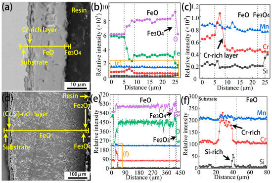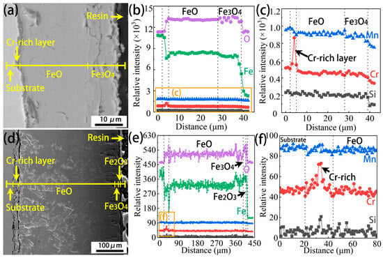 Cross-sectional morphologies and EDS line scan profiles of the Cr0.15 steel oxidized at 1050 °C for 7.5 min and 60 min are shown in Figure 9. It can be seen from Figure 9a that the FeO and Fe3O4 layer can be distinguished slightly at the early stage of oxidation. Moreover, between the FeO layer and the substrate, a Cr-rich layer is observed, as illustrated using the corresponding EDS line scan profiles (Figure 9b,c). The total thickness of the oxide scale is about 36 µm at this moment. With increasing oxidation time, the total thickness of the oxide scale increases significantly, up to about 397 µm (Figure 9d). Moreover, a thin Fe2O3 layer occurs on the Fe3O4 layer, namely on the surface of the Cr0.15 sample, which aligns with the EDS analysis in Figure 4. Similarly to the results for the early stage of oxidation in Figure 9c, a Cr-rich layer is observed, as shown in Figure 9e,f, but a greater Cr-rich distance is displayed (Figure 9f).