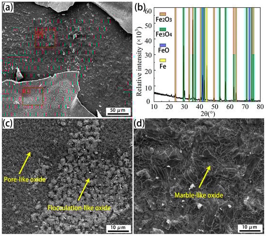 SEM observation of scale morphologies on and below the surface, and the corresponding XRD pattern of the oxide scale for Cr0.015 steel oxidized at 950 °C for 7.5 min. (a) Low-magnification image; (b) the XRD pattern of scales; (c,d) high-magnification images of the red regions in Figure 11a.