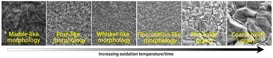 On the basis of the morphology of the surface and below the surface of the designed varying Cr micro-alloyed steels, the morphological evolution of the oxide scale is summarized and shown in Figure 12. With increasing oxidation temperature or time, the morphology evolution of the oxide scale is as follows: marble-like → pore-like → whisker-like → flocculation-like → fine oxide grains → coarse oxide grains.