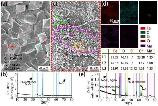 The cross-sectional morphologies of the Cr0.15 steel and Cr1 steel (Figure 9 and Figure 10) show the occurrence of a Cr-rich layer at the early stage (7.5 min). However, with an increase in the oxidation time to 60 min, the Cr1 steel has a (Cr, Si)-rich layer, in contrast to the Cr-rich layer on the Cr0.15 steel. The morphologies of the element-rich layer on both steels oxidized at 1050 °C for 60 min are further observable in Figure 13. The element-rich layer on the Cr0.15 steel was determined to be mainly (Fe, Cr, Mn)3O4 using EDS elemental analysis and the XRD profile (Figure 13a,b). It grows beside the FeO layer, as revealed in Figure 9, and thus diffraction peaks of FeO occur as well (Figure 13b). Compared with the Cr0.15 steel, the Cr1 steel displays a complicated element-rich layer, including three sublayers of L1, L2, and L3, as shown in Figure 13c and the corresponding EDS mapping (Figure 13d). Combining the EDS elemental analysis and the XRD profile, it was determined that the sublayers of L1 and L2 are FeO-(Cr, Fe)2O3 eutectic and FeO-(Cr, Fe, Mn)3O4 eutectic, respectively. The chemical formula of the L3 sublayer could not be reasonably determined, but it is a Si-rich oxide. The L3 sublayer grows above the L1 and L2 sublayers, and is close to the FeO layer, correlating well with the results in Figure 10, in which the enrichment position of Si is close to the FeO layer. The determined phase composition of the oxides shows that FeO-(Cr, Fe, Mn)3O4 eutectic forms on the Cr0.15 steel, but on the Cr1 steel, FeO-(Cr, Fe)2O3 eutectic + Si-rich oxides occur. It has been reported [38,39] that Cr2O3 will transform into gaseous Cr2O3 when specimens are isothermally oxidated at a temperature above 1000 °C. In the current study, FeO-(Cr, Fe)2O3 eutectic formed in L1, and a certain amount of gaseous Cr-rich oxide occurred during the oxidation process, indicated by voids. The formation of FeO-(Cr, Fe)2O3 eutectic and gaseous Cr-rich oxide results in the inability of the Cr element to prevent the diffusion of Fe cations and O2−.
