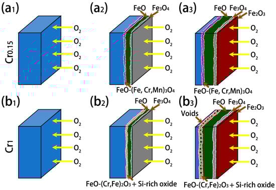 A schematic diagram showing the formation mechanisms of the oxides on the investigated steels is finally summarized and provided in Figure 14. At the initial stage of oxidation, the O2 diffuses to the substrate of the Cr0.15 and Cr1 steels, as shown in Figure 14(a1,b1). With the increasing oxidation time, FeO and Fe3O4 layers form due to the inward diffusion of O2. Meanwhile, FeO-(Cr, Fe, Mn)3O4 eutectic forms on the Cr0.15 steel, but FeO-(Cr, Fe)2O3 eutectic + Si-rich oxides occur on the Cr1 steel, due to its much higher Cr concentration (Figure 14(a2–b2)). The relatively thick (Cr, Si)-rich layer, namely FeO-(Cr, Fe)2O3 eutectic + Si-rich oxides, on the Cr1 steel decelerates the inward diffusion of O2, and thus decreases the oxidation rate [40,41,42]. Afterward, a continuous Fe2O3 layer forms on the pore-like Fe3O4 layer, with the rough surface providing nucleation sites (Figure 14(a3–b3)). Additionally, when the temperature of the Cr1 steel exceeds 1050 °C, voids form in the (Cr, Si)-rich layer. The occurrence of voids in the (Cr, Si)-rich layer and cavities in the FeO and Fe3O4 layers leads to the inability to prevent the inward diffusion of O2 [24,27,42]. As a result, an increase in the oxidation weight gain and oxidation rate occur in the Cr1 steel.