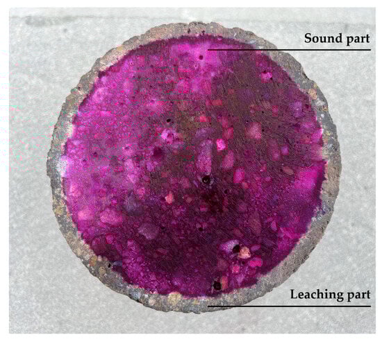 At specified leaching durations (3, 14, 28, 45, and 90 d), specimens are removed from the container and air-dried. Before testing, a handheld cutter is used to perform the mid-height sectioning to expose the evaluation surface. The colorimetric method involved spraying phenolphthalein reagent onto the leached concrete surface. Regions unaffected by leaching exhibited a purple–red color due to alkalinity, while leached areas remained unchanged. The colorimetric test results for the specimen leached for 14 days are shown in Figure 2. Sixteen points are uniformly selected along the concrete leaching front. The digital vernier caliper is used to measure the distance from the specimen edge to the color boundary line at each point. The leaching depth was determined via weighted averaging of these measurements. Specimens of the same mix proportion and leaching duration are subjected to elastic modulus testing using a hydraulic servo universal testing machine.