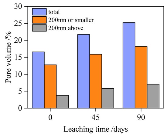 The evolution of porosity in fly ash concrete specimen A2 under the leaching effect is measured using MIP testing, as shown in Figure 4, wherein after leaching, the number of pores larger than 200 nm and smaller than 200 nm within the specimen increases. Specifically, the dissolution of calcium hydroxide (CH) generates larger pores (typically >200 nm), while the decalcification of C-S-H gel produces smaller pores (generally <200 nm).