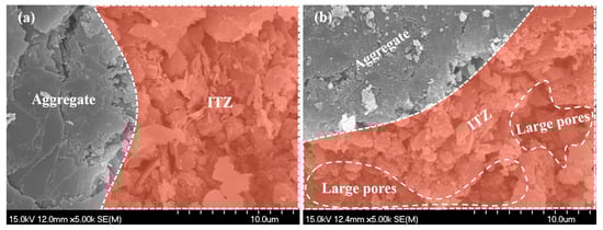 SEM detection for ITZ: (a) before leaching; (b) after leaching.