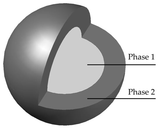 At the macro level, the composition of the two-phase composite sphere consists of two major parts: the inclusion phase and the matrix phase, as shown in Figure 8. This section applies homogenization theory to calculate two-phase composite materials as equivalent spherical elements with an identical elastic modulus. It is noteworthy that the two-phase composite sphere theory establishes an effective analytical framework for probing composite material properties. This model assumes that the composite comprises numerous periodically distributed two-phase spherical units, each consisting of a core and a shell structure. The core represents the inclusion phase, while the shell corresponds to the matrix phase. Both core and shell materials are treated as isotropic and homogeneous, without accounting for microstructural orientation or spatial heterogeneity in material properties [41].