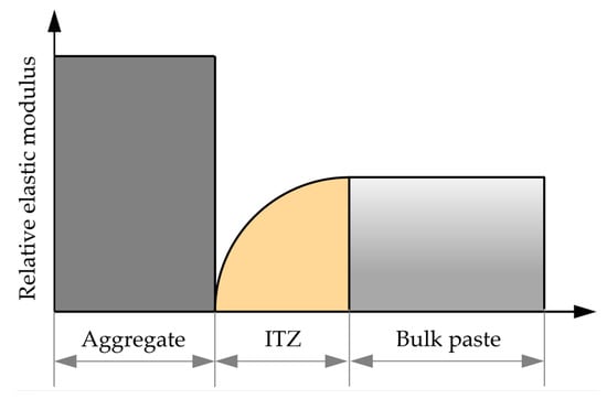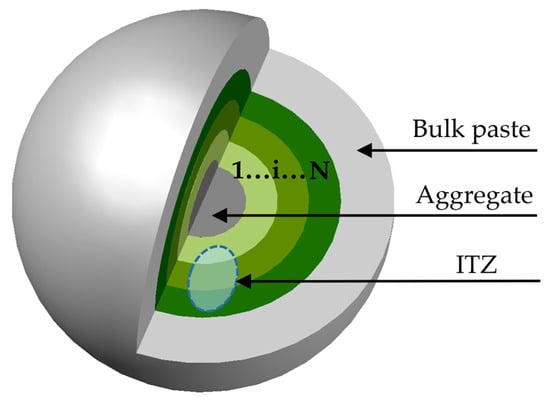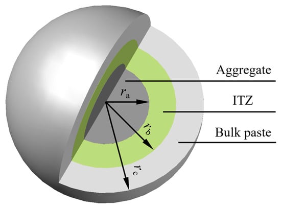 From the mesoscopic perspective, concrete is a three-phase composite material composed of cement bulk paste, ITZ, and aggregate [42,43]. The relative magnitudes of the elastic moduli for the various components of concrete are illustrated in Figure 9 [44]. This section adopts the concentric spheres model shown in Figure 10 to represent the three-phase fly ash concrete. Within this model, the aggregate has an equivalent radius of ra; the region between the inner radius ra and the outer radius rb represents the ITZ; and the region between the inner radius rb and the outer radius rc represents the fly ash–cement paste.