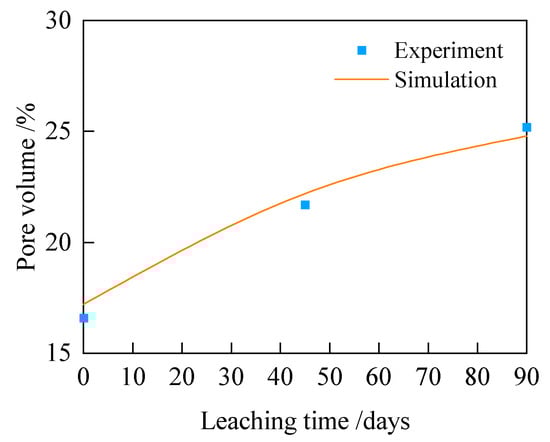 To validate the effectiveness of the porosity calculation model for leached fly ash concrete established in this study, the calculated results are compared with the MIP test results. The comparison between the two is shown in Figure 12, wherein the experimental values are highly consistent with the calculated values, with a correlation coefficient of 0.971, thereby validating the effectiveness of the porosity calculation method.