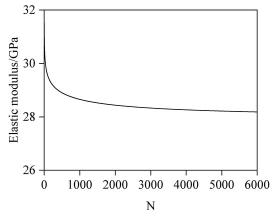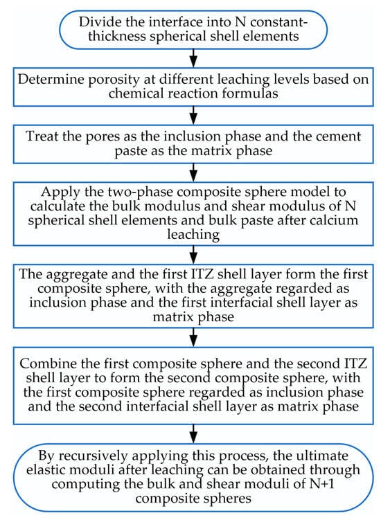 Through analysis of computational results under varying N-values, this study establishes the variation pattern of elastic modulus with the number of spherical shell elements (N), as depicted in Figure 13. Significant solution oscillations occur at lower N-values, attributable to insufficient discretization refinement for accurately capturing radial variations in ITZ porosity, thereby compromising modulus calculation accuracy. As N increases, results progressively stabilize. Computational solutions are considered converged when N ≥ 3000, satisfying prescribed accuracy requirements. This convergence confirms that the discretized spherical shell elements sufficiently resolve interfacial porosity gradients, yielding reliable elastic modulus predictions for leached concrete. The complete computational workflow is illustrated in Figure 14.