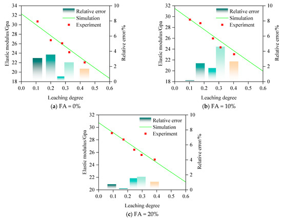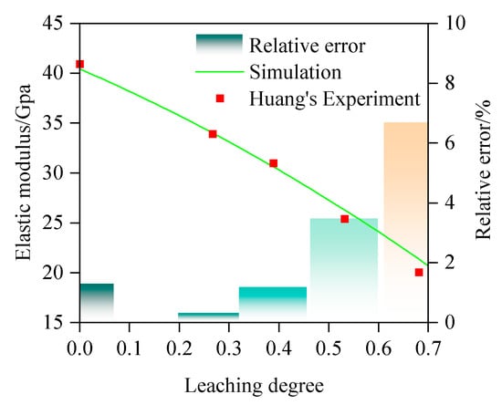 To verify the general applicability of the established model, we also selected third-party experimental results for validation. The test results from Huang et al. [54] are selected for validation. In their experiments, they employed Type I ordinary Portland cement (ASTM C150 Grade 42.5) with a water-to-cement ratio of 0.53. The concrete mix design incorporated continuously graded aggregates (0.15–20.0 mm) adhering to Fuller’s optimal curve, maintaining a 70% aggregate volume fraction. Specimens were demolded 24 h post-casting and subsequently cured under standard conditions (20 ± 2 °C, >95% RH) for 28 days. Following curing, samples underwent chemical leaching treatment via immersion in 6 mol/L ammonium nitrate solution. The elastic modulus of leached specimens was determined using the MTS810 hydraulic servo universal testing machine (MTS Industrial Systems (China) Co., Ltd., Beijing, China). The specific fixed parameters (e.g., the bulk modulus and shear modulus of the aggregate, the morphology of the aggregate, etc.) used in the simulation are the same as those in the first validation case. The comparison between the simulation and experimental results is illustrated in Figure 16, showing that the simulation results are in good agreement with the experimental data. The corresponding correlation coefficient is calculated as 0.988. This comparison result further validates the reliability of the methodology proposed in this study. The relative error between the simulated values and Huang’s experimental values is shown in Figure 16, where the relative error of both is within 8%, which once again verifies the reliability of the simulation method employed in this study.