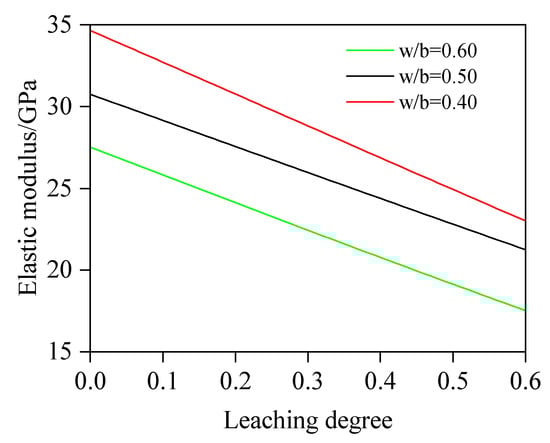 In the simulation analysis, the parameter values are shown in Table 4. It is noteworthy that the morphology of the aggregate is assumed to be spherical. The range of aggregate particle size is 0.3–16 mm and follows the Fuller distribution, and the aggregate adopts Fuller gradation. The relationship between E and Dc at different w/b values is shown in Figure 17, demonstrating that under identical Dc values, E decreases with an increasing w/b, primarily due to prominently elevated porosity induced by higher w/b values. Quantitative analysis reveals that the elastic modulus ratios (relative to the value at 60.0% leaching) at 10.0%, 30.0%, and 50.0% leaching degrees are 1.42, 1.25, and 1.08 for w/b = 0.4; 1.37, 1.22, and 1.07 for w/b = 0.5; and 1.47, 1.28, and 1.09 for w/b = 0.6. Notably, for Dc = 10.0%, 30.0%, and 50.0%, E at w/b = 0.40 exceeds that of w/b = 0.60 by 26.71%, 28.43%, and 30.28%, respectively, highlighting the pronounced impact of w/b on mechanical performance. Correspondingly, for a water–cement ratio of 0.4 and dissolution degrees of 0, 10%, 30%, 50%, and 60%, the porosity of concrete is 12.47%, 14.52%, 18.62%, 22.71%, and 24.76%, respectively; 16.63%, 18.34%, 21.77%, 25.21%, and 26.92% for w/b = 0.5; and 20.10%, 21.97%, 25.73%, 29.49%, and 31.37% w/b = 0.6. The mechanism of w/b on the elastic modulus of concrete can be explained as follows: The w/b governs porosity and hydration product density. Higher w/b values generate excess capillary pores from free water evaporation and less hydration products, reducing matrix compactness. In addition, these pores weaken aggregate–paste interfacial stiffness, diminishing load-transfer capacity and thus the elastic modulus of concrete. Conversely, lower w/b promotes dense hydration products (e.g., C-S-H gels), decreasing porosity and enhancing the modulus of concrete.
