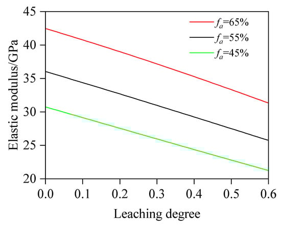 Regarding the influence of fa on E, w/b is fixed at 0.5, and fa is 45%, 55%, and 65%. The values of other variables are consistent with those in Section 4.2.1. Figure 19 shows the relationship between E and Dc at various fa values, where for a given degree of leaching, the elastic modulus increases with the rise in fa. Quantitative analysis shows the following: at concrete leaching degrees of 10.0%, 30.0%, and 50.0%, the elastic modulus of concrete with fa = 65% is 18.58%, 19.99%, and 21.17% higher, respectively, than that of concrete with fa = 55%; the elastic modulus of concrete with fa = 55% is 17.91%, 19.30%, and 20.59% higher, respectively, than that of concrete with fa = 45%; and the elastic modulus of concrete with fa = 65% is 39.82%, 43.15%, and 46.12% higher, respectively, than that of concrete with fa = 45%. From the simulation results, the variation regulation of the elastic modulus is sensitive to the volume fraction of the aggregate and exhibits a similar linear variation pattern.