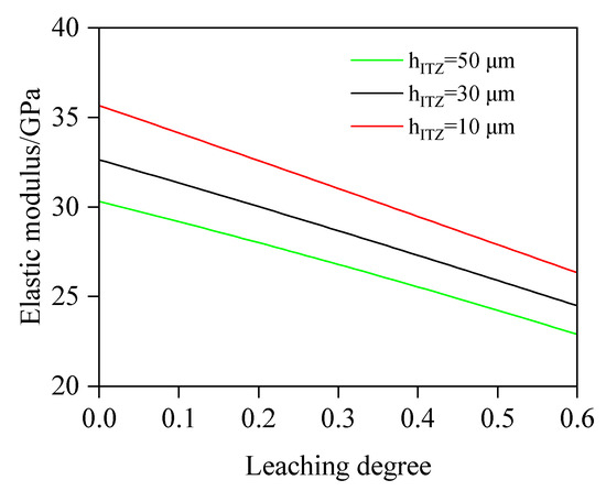 In this case, w/b is fixed at 0.5, FA is 0%, and the ITZ thickness is 10, 30, and 50 μm. The values of other variables are consistent with those in Section 4.2.1. Figure 20 presents the relationship between E and Dc at different ITZ thicknesses. The results demonstrate that under identical leaching degrees, E decreases with an increasing ITZ thickness, primarily due to the higher porosity and lower elastic modulus in the ITZ. Quantitative analysis reveals that when hITZ decreases from 50 μm to 10 μm, E significantly increases by 16.96%, 15.80%, and 15.11% at 10.0%, 30.0%, and 50.0% leaching degrees, respectively. These findings highlight that reducing hITZ can effectively avoid the elastic modulus reduction induced by calcium leaching.