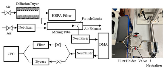 Figure 1 shows the experimental arrangement employed in this study, which was similar to the one previously described by Boskovic et al. [5]. A portion of the concentrated particle suspension (either iron oxide, magnesium oxide, zinc oxide, or nanotubes), prepared as described earlier, was gradually introduced, in 0.1 mL increments, into approximately 20 mL of nano-pure water within a single jet Collison nebulizer. This process ensured the generation of a representative quantity of particles for each size employed in the experiments. Subsequently, the aerosolization was accomplished using a flow of 2 L/min of compressed ultra-high purity air to produce the test aerosol. To ensure effective drying of moisture from the particle surface, the aerosol stream was combined in a mixing tube with 10 L/min of dry HEPA-filtered air and passed through a charge neutralizer (10-mCi85Kr, model 3012, TSI Inc., Shoreview, MN, USA) before reaching an Electrostatic Classifier (EC) (Model 3080N, TSI Inc., Shoreview, MN, USA) containing a DMA column (Model 3081, TSI Inc., Shoreview, MN, USA). This charge neutralizer imparts a predictable charge distribution to aerosol particles, effectively minimizing the impact of electrostatic forces and ensuring that particle charges do not interfere with the subsequent filtration measurements. To ensure equilibrated charge on all particles involved in the experiments, the neutralizer (Model 3088, TSI Inc., Shoreview, MN, USA) was also used after the DMA column at the filter entry point for all types of particles in all experimental runs (see inset in Figure 1).