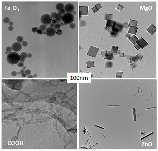 In this research four different types of nanoparticles were used, including spherical iron oxide nanoparticles (Fe2O3, density—5.2 g/cm3), cubic magnesium oxide nanoparticles (MgO, density—3.6 g/cm3), straight rod-shaped zinc oxide (ZnO, density—5.61 g/cm3) and curved nanotubes COOH (functionalized multi-walled carbon nanotubes with a density ~1.9 g/cm3, obtained from Cheap Tubes Inc., Grafton, VT, USA). The direct metal combustion procedures, outlined in detail in our previous works [5,19], were used to produce all three metal nano-oxides mentioned above. In brief, pure metals were subjected to combustion, resulting in the formation of nanoparticles in the gas phase. These nanoparticles were collected on a suitable substrate, carefully brushed from the surface, and added to nano-pure deionized water with a resistivity of >18.0 MΩ to produce highly concentrated suspensions. The suspensions underwent sonication for a minimum of 15 min to minimize the number of agglomerates potentially present in the nano-powder after collection on the substrate.