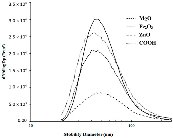Before experiments with each type of particle, the size distribution was obtained to ensure that a representative number of at least 1000 cm−3 particles for each size used in the experiments could be generated. As discussed before, to obtain these values, small aliquots of the concentrated suspension, prepared as described above, were gradually added to 20 mL of nano-pure water in the nebulizer, and the device was operated. The filtration flow rate of 0.3 L/min (based on the operation flow rate of the CPC), which was associated with the filter face velocity of 14 mm/s, was used in all the experiments. The size distribution scan, obtained by the EC operating in the “Analog control” mode, was adjusted by adding more aliquots of the concentrated particle suspension until the required concentrations were achieved. This step is very important, as excessive numbers of particles used in the experiments could exceed the upper limit for reliable instrument operation (5.5 × 104 cm−1) and introduce some errors to the experimental results. Figure 4 illustrates the results of the optimized size distribution obtained from the “bypass” line for all types of particles. As is seen, all the tested aerosols exhibit reasonably similar trends with sufficient numbers of particles obtained for all sizes within the range of 40–250 nm.