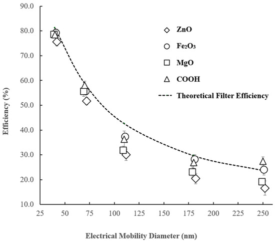 The concentrations of particles passing the bypass line (upstream concentration) and filter line (downstream concentration) are denoted by CA and CB, respectively. Figure 5 depicts the experimental filter efficiency for all the investigated particles, alongside the theoretical filter efficiency estimated by Equations (1) and (2) for the filter and process parameters outlined above. The error bars, representing the standard deviation of all five experimental runs, are included. The main outcomes derived from Figure 5 can be summarized as follows:
