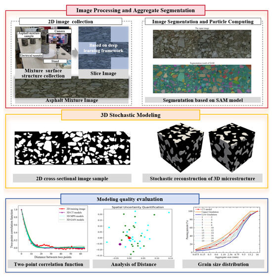 The first step of our asphalt mixture modeling method is the image acquisition and processing of high-resolution 2D images. There are three basic modules. At first, a smartphone-based imaging system is designed to capture the spatial structure of the material surface. To tackle uneven illumination problems, the camera configuration is carefully specified to ensure image consistency. Then, we use an image quilting program to integrate several multi-angle images. With the purpose of conserving geometric integrity, a group of small images associated with limited viewpoints are combined into a unified large-size image. Finally, the pretrained SAM network is used to distinguish the aggregate grain and asphalt binder. As a foundational segmentation method, SAM has strong generalization ability to accurately identify target material components. The robust grain segmentation of SAM has a substantial influence on the structural characterization of heterogeneous asphalt materials.