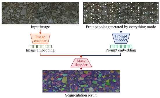 As Figure 4 shows, the SAM program comprises three main modules. (1) Based on the ViT architecture, the image encoder network pays attention to analyzing the input image. A high-dimensional feature vector is produced to represent the visual content. In the feature space, the images with similar spatial structures share the close feature vectors. (2) The prompt encoder module converts the user-defined prompts into a high-dimension embedding. The input prompt plays a key role in guiding the SAM segmentation result. (3) The mask decoder network is dedicated to generating the final segmentation mask. Based on compatible image features and prompt information, the aggregates and asphalt binder are separated at the pixel level. The ability of the decoder has a substantial effect on the flexibility and robustness of the SAM program.