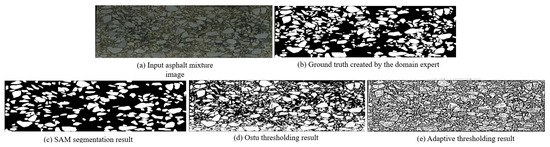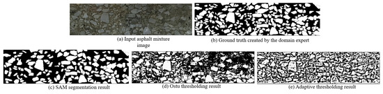 One key innovation of our SAM-driven program is that there is no network training and image labeling step. Based on a pretrained weight, SAM is activated to tackle the asphalt mixture image. Our program identifies the aggregate grain according to the pixel intensity of each mask. In Figure 6 and Figure 7, we display the segmentation result conducted by Ostu thresholding and adaptive thresholding programs. It is clear that the thresholding methods do not yield favorable results. The main reason is that the digital image processing technique is heavily dependent on the pixel intensity. It is challenging to find a suitable boundary to separate two material components. A complicated dependency exists between aggregate grains and asphalt binder. In our work, the computer activates the powerful SAM network to analyze the image and create high-quality masks. The introduction of a foundational segmentation model has a helpful effect on the grain identification task.