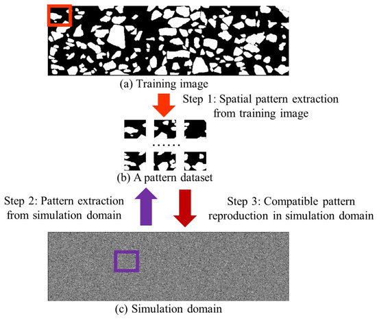 As an emerging method in the field of stochastic modeling, Multiple-Point Statistics (MPS) has gained considerable attention from scientific researchers and the engineering community. The main advantages of MPS are that a training image becomes the prior knowledge to explicitly express the spatial phenomenon of interest. Based on a training image, MPS attempts to capture geometrically complex patterns by simultaneously considering multiple points. As Figure 8 exhibits, there are three main steps within the MPS framework. First, the program employs a template to extract spatial patterns from training images. A square or circle is commonly used in the general-purpose scenario. To extract complicated structures, researchers explore templates with irregular shapes and flexible conditioning points. A collection of training patterns is extracted by checking every feasible point in a training image. The program builds a dataset to store all training patterns in computer memory. Second, the modeling procedure concentrates on generating new realizations. Based on the template, the computer visits an unknown point in the simulation domain. A conditioning pattern is created to explain spatial structures in the neighborhood. As the core component, a searching program is launched to find matching instances to the conditioning pattern. The Hamming distance is widely used to deal with the segmented image and categorical variable. In comparison, the continuous variable is tackled by the Euclidean distance. Third, the center point of compatible training patterns becomes the prediction result of the unknown point. In this case, a random sampling program is used to select one candidate point from multiple matching patterns. The point simulation program mentioned above is repeatedly performed until every point in the simulation grid is informed.